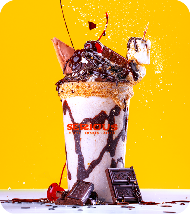 Toasted Marshmallow & Chocolate Ice Cream, Marshmallow Fluff Rim w/ Crushed Graham Cracker, Chocolate Syrup, Toasted Marshmallows, Smore’s Pop Tart, Hershey’s Chocolate Bar, Whipped Cream, Cherry.